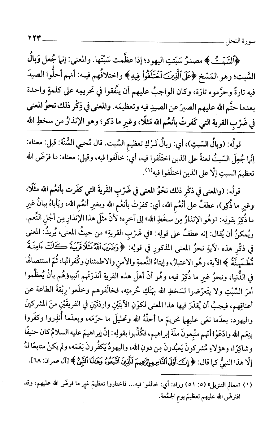 قوله: (والمعنى في ذكر ذلك نحو المعنى في ضرب القرية التي كفرت بأنعم الله مثلاً وغير ما ذُكر)، عطفٌ على أنعم الله، أي: كفرتُ بأنعمِ الله وبغيرِ أنعم الله، ويأباهُ بيان غير ما ذُكر بقوله: "وهو الإنذار من سخط الله" إلى آخره؛ لأن مثل هذا الإنذار من أجل النعم. ويُمكنُ أن يقال: إنه عطفٌ على قوله: "في ضربِ القرية" من حيث المعنى، يريد: المعنى في ذكر هذه الآية نحو المعنى المذكور في قوله: (وَضَرَبَ اللَّهُ مَثَلاً قَرْيَةً كَانَتْ آمِنَةً مُطْمَئِنَّةً) الآية، وهو الاعتبار، وإيتاء النعمة والأمن والاطمئنان وكُفرانها، ثم استئصالها في الدنيا، ونحو غير ما ذُكر فيه، وهو أن أهل هذه القرية أنذرتهم أنبياؤهم بأن يُعظموا أمر السبت ولا يتعرضوا لسخط الله بهتك حرمته، فخالفوهم وخلعوا ربقة الطاعة عن أعناقهم، فيجبُ أن يقدر فيها هذا المعنى لكون الآيتين واردتين في الفريقين من المشركين واليهود، بعدما نعى عليهما تحريم ما أحله الله وتحليل ما حرمه، وبعدما أُنذروا وكفروا بنعم الله وادعوا أنهم متبعون ملة إبراهيم، فكُذبوا بقوله: إن إبراهيم عليه السلام كان حنيفاً وشاكراً، وهؤلاء مشركون يعبدون من دون الله، واليهود يكفرون نعمه، ولم يكن متابعاً له إلا هذا النبي كما قال: (إِنَّ أَوْلَى النَّاسِ بِإِبْرَاهِيمَ لَلَّذِينَ اتَّبَعُوهُ وَهَذَا النَّبِيُّ) [آل عمران: 68].