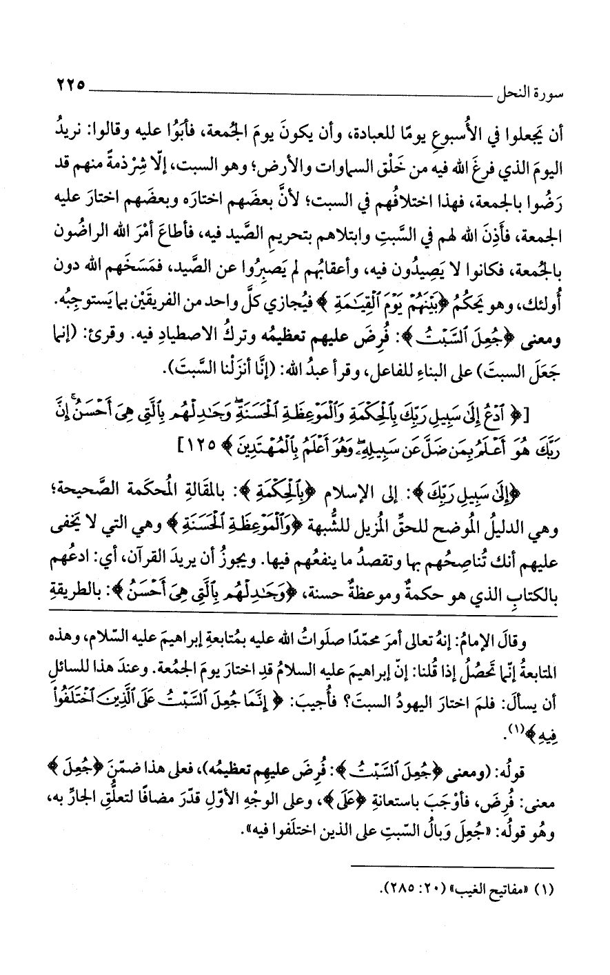 وقال الإمام: إنهُ تعالى أمر محمداً صلوات الله عليه بمتابعة إبراهيم عليه السلام، وهذه المتابعة إنما تحصلُ إذا قلنا: إن إبراهيم عليه السلام قد اختار يوم الجمعة. وعند هذا للسائل أن يسأل: فلم اختار اليهود السبت؟ فأجيب: (إِنَّمَا جُعِلَ السَّبْتُ عَلَى الَّذِينَ اخْتَلَفُوا فِيهِ).