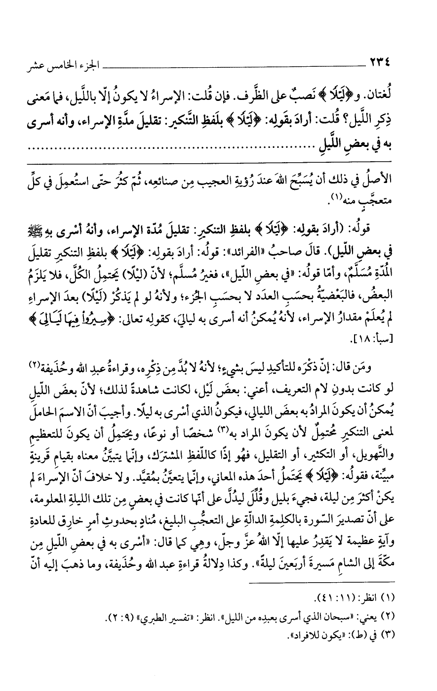 قوله: (أراد بقوله: (لِيلاً) بلف التنكير: تقليل مُدة الإسراء، وأنه أسري به صلى الله عليه وسلم في بعض الليل). قال صاحب "الفرائد": قوله: أراد بقوله: (لِيلاً) بلفظ التنكير تقليل المدة مسلمٌ، وأما قوله: "في بعض الليل"، فغيرُ مسلم؛ لأن (لِيلاً) يحتمل الكُل، لا يلزمُ البعضُ، فالبعضية بحسب العدد لا بحسب الجزء؛ ولأنه لو لم يذكر (لِيلاً) بعد الإسراء لم يُعلم مقدارُ الإسراء، لأنه يمكنُ أنه أسرى به ليالي، كقوله تعالى: (سِيرُوا فِيهَا لَيَالِي) [سبأ: 18].
