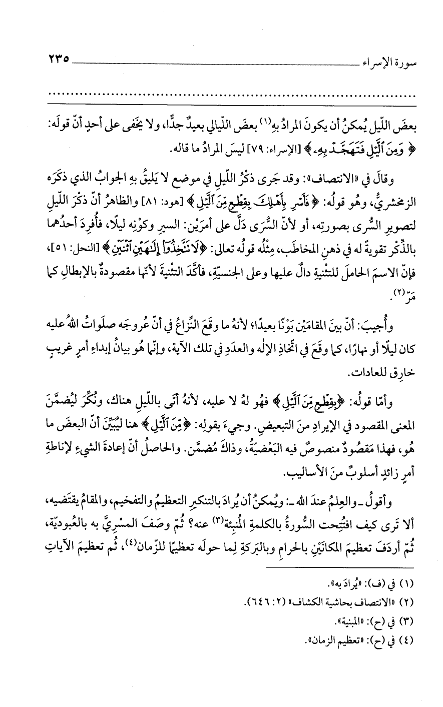 وقال في "الانتصاف": وقد جرى ذكرُ الليل في موضع لا يليق به الجواب الذي ذكره الزمخشري، وهو قوله: (فَأَسْرِ بِأَهْلِكَ بِقِطْعٍ مِنْ اللَّيْلِ) [هود: 81] والظاهر أن ذكر الليل لتصوير السُّرى بصورته، أو لأن السُّرى دل على أمرين: السير وكونه ليلاً، فأفرد أحدهما بالذكر تقوية له في ذهن المخاطب، مثله قوله تعالى: (لا تَتَّخِذُوا إِلَهَيْنِ اثْنَيْنِ) [النحل: 51]، فإن الاسم الحامل للتثنية دالٌ عليها وعلى الجنسية، فأكد التثنية لأنها مقصودة بالإبطال كما مر.