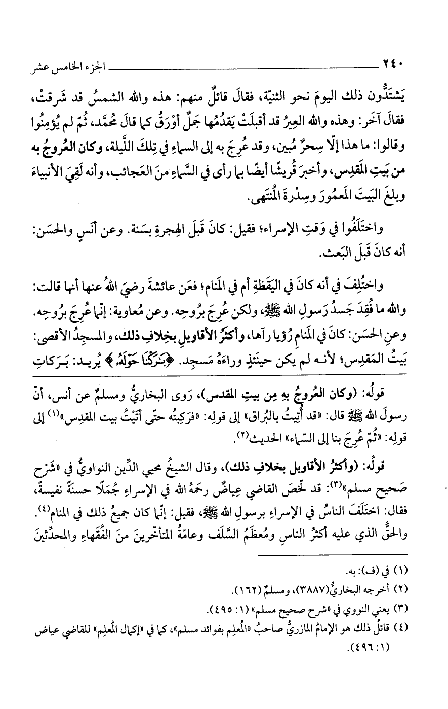 قوله: (وأكثر الأقاويل بخلاف ذلك)، وقال الشيخ محيي الدين النواوي في "شرح صحيح مسلم": قد لخص القاضي عياض رحمه الله في الإسراء جُملاً حسنةً نفيسةً، فقال: اختلف الناس في الإسراء برسول الله صلى الله عليه وسلم، فقيل: إنما كان جميع ذلك في المنام. والحق الذي عليه أكثر الناس ومعظمُ السلف وعامةُ المتأخرين من الفقهاء والمحدثين