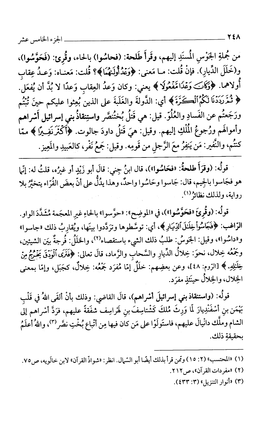 قوله: (وقرأ طلحة: "فحاسُوا")، قال ابنُ جني: قال أبو زيد أو غيره، قلتُ له: إنما هو فجاسوا بالجيم، قال: جاسوا وحاسوا واحدٌ، وهذا يدل على أن بعض القراء يتخير بلا رواية، ولذلك نظائر.
