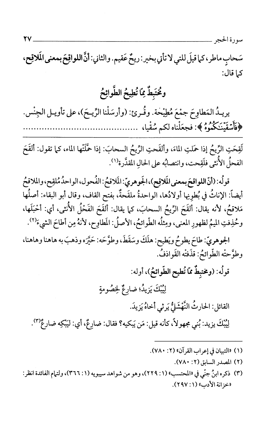 قوله: (أن اللواقح بمعنى الملاقح)، الجوهري: الملاقح: الفحول، الواحد ملقح، والملاقح أيضاً: الإناث في بطونها أولادها، الواحدة ملقحة، بفتح القاف، وقال أبو البقاء: أصلها ملاقح، لأنه يقال: ألقح الريح السحاب، كما يقال: ألقح الفحل الأنثى، أي: أحبلها، وحُذفت الميم لظهور المعنى، ومثله الطوائح، الأصل: المطاوح، لأنه من أطاح الشيء.