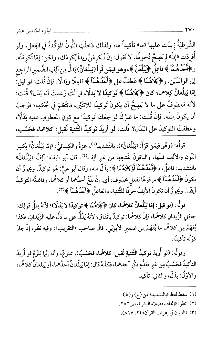 الشرطية زيدت عليها «ما» تأكيدا لها، ولذلك دخلت النون المؤكدة في الفعل، ولو أفردت «إن» لم يصح دخولها، لا تقول: إن تكرمن زيدًا يكرمك، ولكن إما تكرمنه. (وأَحَدُهُما) فاعل (يبلغنّ)، وهو فيمن قرأ يبلغان بدل من ألف الضمير الراجع إلى الوالدين. وكِلاهُما عطف على أحدهما فاعلا وبدلا. فإن قلت: لو قيل إما (يبلغان) كلاهما، كان (كلاهما) توكيدا لا بد لا، فمالك زعمت أنه بدل؟ قلت: لأنه معطوف على ما لا يصح أن يكون توكيدا للاثنين، فانتظم في حكمه، فوجب أن يكون مثله. فإن قلت: ما ضرّك لو جعلته توكيدًا مع كون المعطوف عليه بدلا، وعطفت التوكيد على البدل؟ قلت: لو أريد توكيد التثنية لقيل: كلاهما، فحسب،