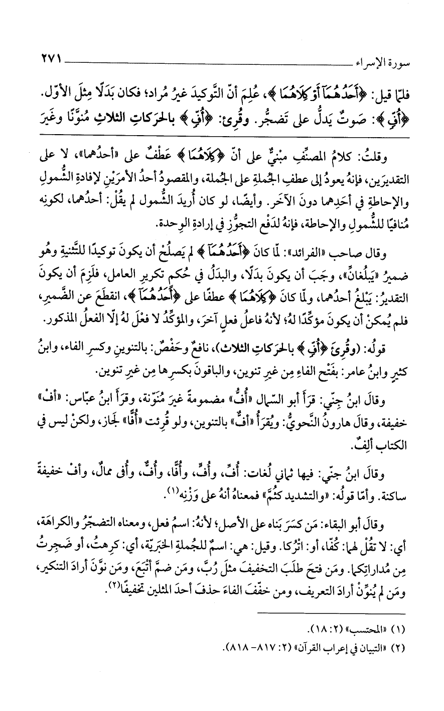 وقال أبو البقاء: من كسر بناه على الأصل؛ لأنه: اسم فعل، ومعناه التضجر والكراهة، أي: لاتقل لهما: كُفا، أو: اتركا. وقيل: هي: اسمٌ للجمل الخبرية، أي: كرهت، أو ضجرت من مداراتكما. ومن فتح طلب التخفيف مثل رب، ومن ضم أتبع، ومن نون أراد التنكير، ومن لم ينون أراد التعريف، ومن خفف الفاء حذف أحد المثلين تخفيفاً.