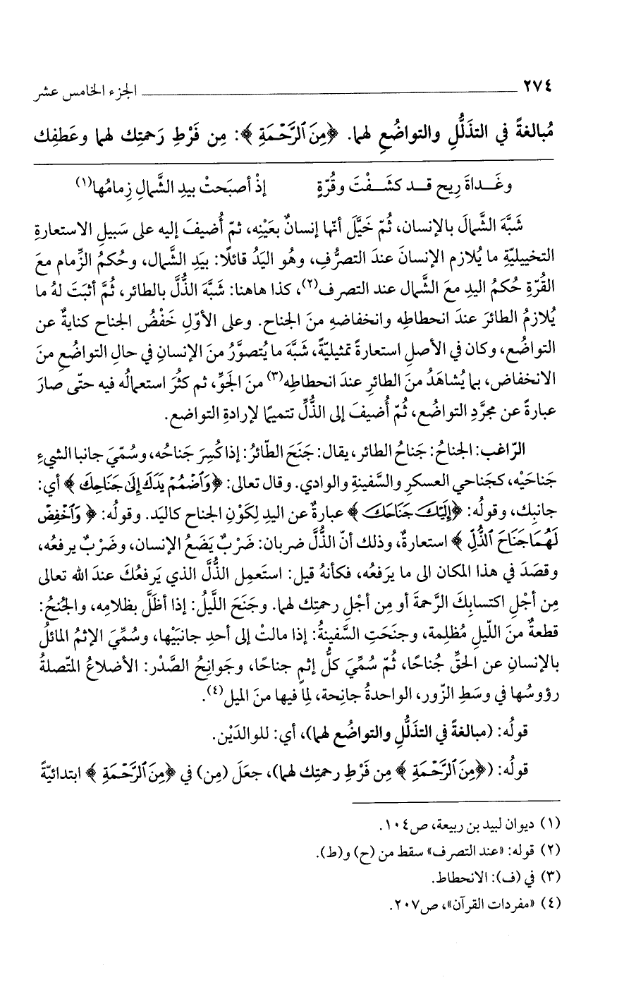 شبه الشمال بالإنسان، ثم خيل أنها إنسانٌ بعينه، ثم أضيف إليه على سبيل الاستعارة التخيلية ما يُلازم الإنسان ند التصرف، وهو اليد قائلاً: بيد الشمال، وحكم الزمام مع القرة حكم اليد مع الشمال عند التصرف، كذا هاهنا: شبه الذل بالطائر، ثم أثبت له ما يلازم الطائر عند انحطاطه وانخفاضه من الجناح. وعلى الأول خفض الجناح كناية عن التواضع، وكان في الأصل استعارة تمثيلية، شبه ما يتصور من الإنسان في حال التواضع من الانخفاض، بما يشاهد من الطائر عند انحطاطه من الجو، ثم كثر استعماله فيه حتى صار عبارة عن مجرد التواضع، ثم أضيف إلى الذل تتميماً لإرادة التواضع.