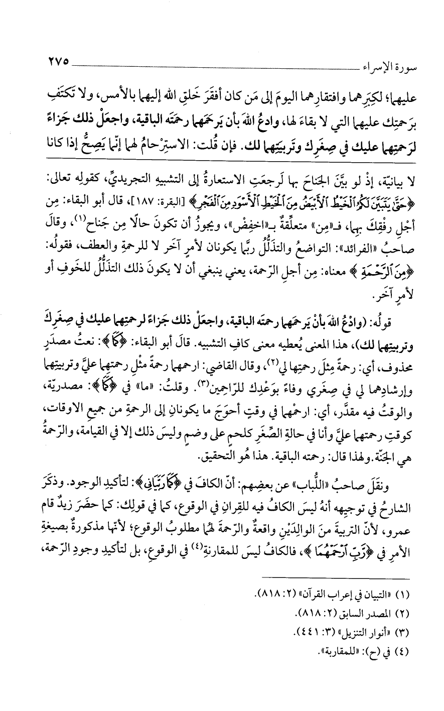 ونقل صاحب "اللباب" عن بعضهم: أنا لكاف في (كَمَا رَبَّيَانِي): لتأكيد الوجود. وذكر الشارح في توجيهه أنه ليس الكاف فيه للقران في الوقوع، كما في قولك: كما حضر زيدٌ قام عمرو، لأن التربية من الوالدين واقعة والرحمة لهما مطلوب الوقوع؛ لأنها مذكورة بصيغة الأمر في (رَّبِّ ارْحَمْهُمَا)، فالكاف ليس للمقارنة في الوقوع، بل لتاكيد وجود الرحمة،