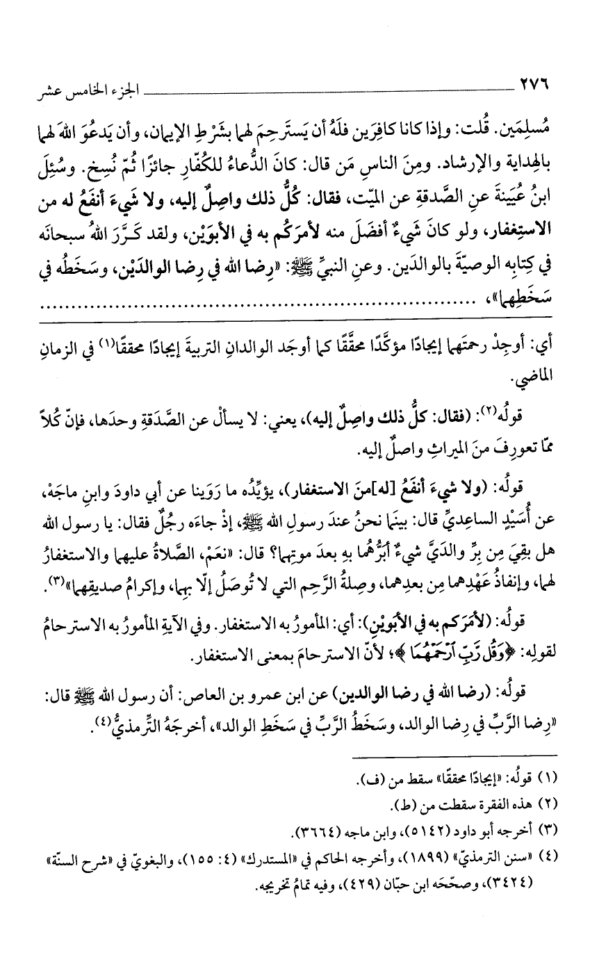 قوله: (لأمركم به في الأبوين): أي: المأمور به الاستغفار. وفي الآية المأمور به الاسترحام لقوله: (وَقُلْ رَّبِّ ارْحَمْهُمَا)؛ لأن الاسترحام بمعنى الاستغفار.