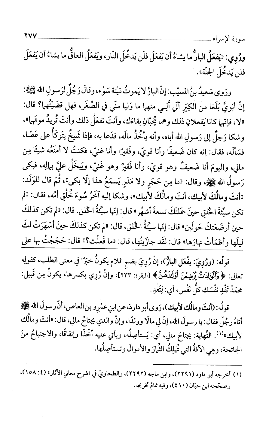 وروى سعيد بن المسيب: إنّ البارّ لا يموت ميتة سوء. وقال رجل لرسول الله صلى الله عليه وسلم: إنّ أبويّ بلغا من الكبر أني ألي منهما ما وليا مني في الصغر، فهل قضيتهما؟ قال: لا، فإنهما كان يفعلان ذلك وهما يحبان بقاءك، وأنت تفعل ذلك وأنت تريد موتهما»، وشكا رجل إلى رسول الله أباه وأنه يأخذ ماله، فدعا به فإذا شيخ يتوكأ على عصا، فسأله فقال: إنه كان ضعيفًا وأنا قوى، وفقيرًا وأنا غنيّ، فكنت لا أمنعه شيئًا من مالي، واليوم أنا ضعيف وهو قوي، وأنا فقير وهو غنيّ، ويبخل عليّ بماله، فبكى رسول الله صلى الله عليه وسلم وقال: ما من حجر ولا مدر يسمع هذا إلا بكى، ثم قال للولد: أنت ومالك لأبيك، أنت ومالك لأبيك. وشكا إليه آخر سوء خلق أمّه فقال: لم تكن سيئة الخلق حين حملتك تسعة أشهر؟ قال: إنها سيئة الخلق. قال: لم تكن كذلك حين أرضعتك حولين؟ قال إنها سيئة الخلق. قال: لم تكن كذلك حين أسهرت لك ليلها وأظمأت نهارها؟