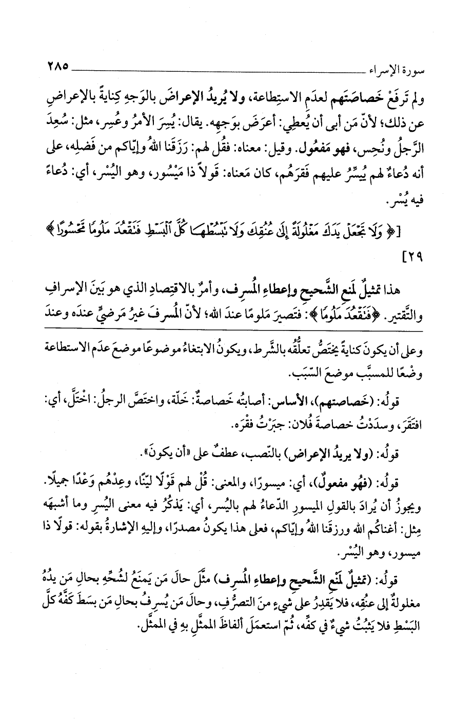 هذا تمثيلٌ لمنع الشحيح وإعطاء المسرف، وأمر بالاقتصاد الذي هو بين الإسراف والتقتير (فَتَقْعُدَ مَلُومًا) فتصير ملوما عند الله، لأنّ المسرف غير مرضى عنده وعند