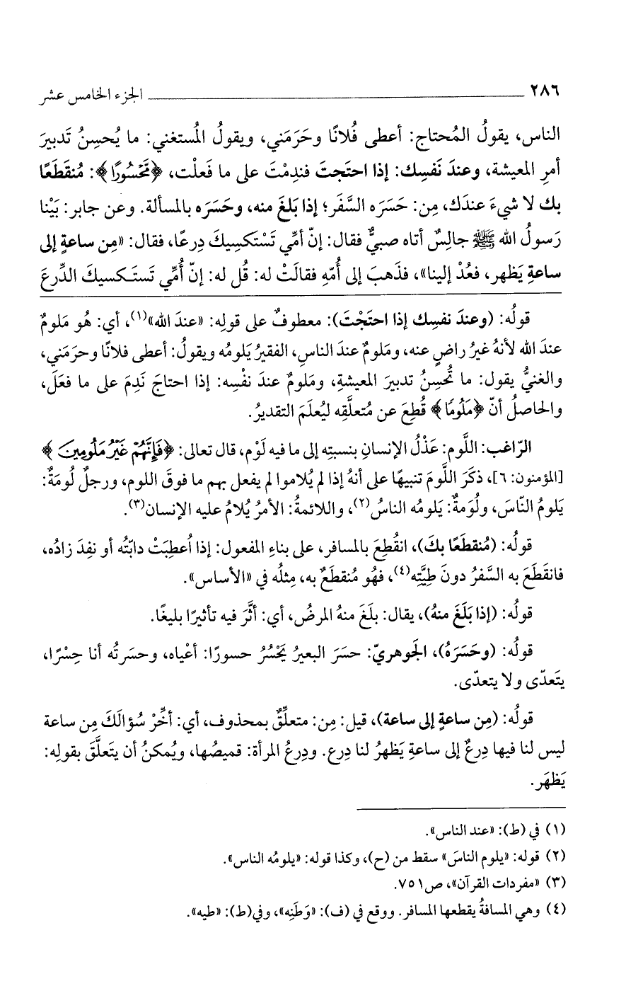 إذا احتجت فندمت على ما فعلت (مَحْسُورًا): منقطعًا بك لا شيء عندك، من حسره السفر إذا بلغ منه وحسره بالمسألة، وعن جابر: بينا رسول الله صلى الله عليه وسلم جالس أتاه صبى فقال: إنّ أمي تستكسيك درعاً، فقال من ساعة إلى ساعة يظهر، فعد إلينا، فذهب إلى أمّه فقالت له قل له: إن أمي تستكسيك الدرع