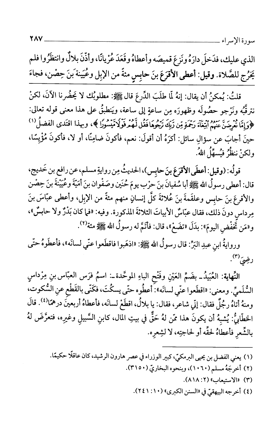 قوله: (وقيل أعطى الأقرع بن حابس)، الحديث من رواية مسلم، عن رافع بن خديج، قال: أعطى رسول الله صلى الله عليه وسلم أبا سفيان بن حرب يوم حنين وصفوان بن أمية وعيينة بن حصن والأقرع بن حابس وعلقمة بن علاثة كل إنسان منهم مئة من الإبل، وأعطى عباس بن مرداس دون ذلك، فقال عباس الأبيات الثلاثة المذكورة. وفيه: "فما كان بدرٌ ولاحابسٌ"، و"من تخفض ايوم": بدل "تضع"، قال: فأتم له رسول الله صلى الله عليه وسلم مئة.
