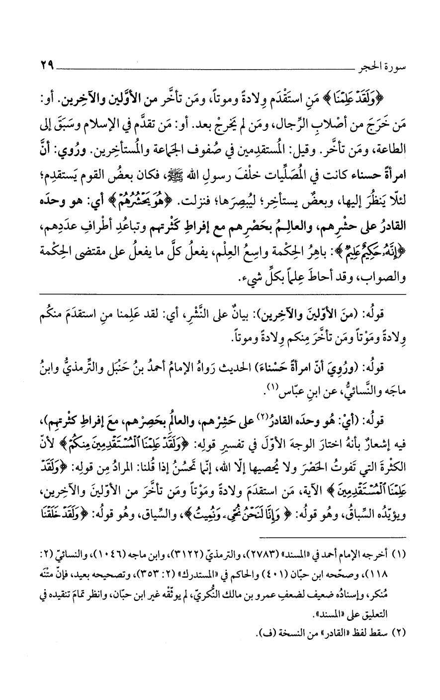 قوله: (أي: هو وحده القادر على حشرهم، والعالم بحصرهم، مع إفراط كثرتهم)، فيه إشعار بأنه اختار الوجه الأول في تفسير قوله: (وَلَقَدْ عَلِمْنَا الْمُسْتَقْدِمِينَ مِنْكُمْ) لأن الكثرة التي تفوت الحصر ولا يحصيها إلا الله، إنما تحسن إذا قلنا: المراد من قوله: (وَلَقَدْ عَلِمْنَا الْمُسْتَقْدِمِينَ) الآية، من استقدم ولادة وموتاً ومن تأخر من الأولين والآخرين، ويؤيده السباق، وهو قوله: (وَإِنَّا لَنَحْنُ نُحْيِ وَنُمِيتُ)، والسياق، وهو قوله: (وَلَقَدْ خَلَقْنَا