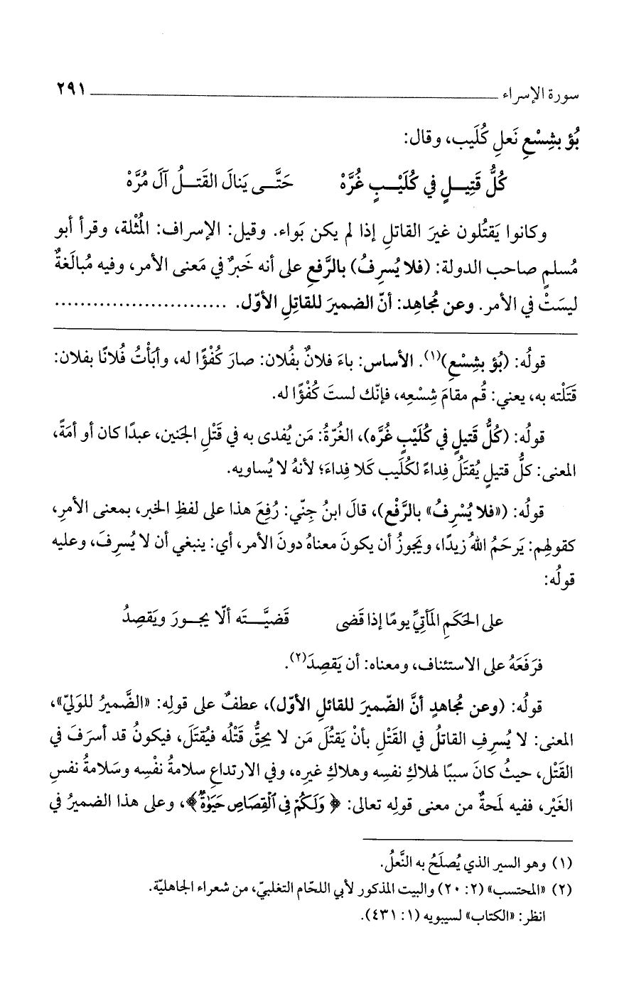 قوله: ("فلا يُسرفُ" بالرفع)، قال ابن جني: رُفع هذا على لفظ الخبر، بمعنى الأمر، كقولهم: يرحم الله زيداً، ويجوز أن يكون معناه دون الأمر، أي: ينبغي أن لا يسرف، وعليه قوله: