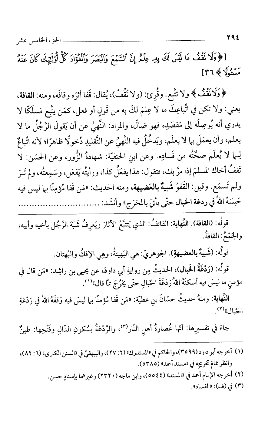[(وَلا تَقْفُ ما لَيْسَ لَكَ بِهِ عِلْمٌ إِنَّ السَّمْعَ وَالْبَصَرَ وَالْفُؤادَ كُلُّ أُولئِكَ كانَ عَنْهُ مَسْؤُلًا)].