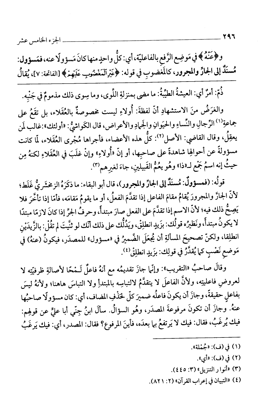 وقال صاحب "التقريب": وإنما جاز تقديمه مع أنه فاعل لمحاً لأصالة ظرفيته لا لعروض فاعليته، ولأن الفاعل لا يتقدم لالتباسه بالمبتدأ ولا التباس هاهنا؛ لو أنه ليس بفاعل حقيقة، وجاز أن يكون فاعله ضمير كل لحذف المضاف، أي: كان مسؤولاً صاحبها عنه. وجاز أن تكون مرفوعة المصدر، وهو السؤال. سأل ابن جني أبا علي عن قولهم: فيك يُرغبُ، فقال: فيك لا يرتفع بما بعده، فأين المرفوع؟ فقال: المصدر، أي: فيك يرغبُ