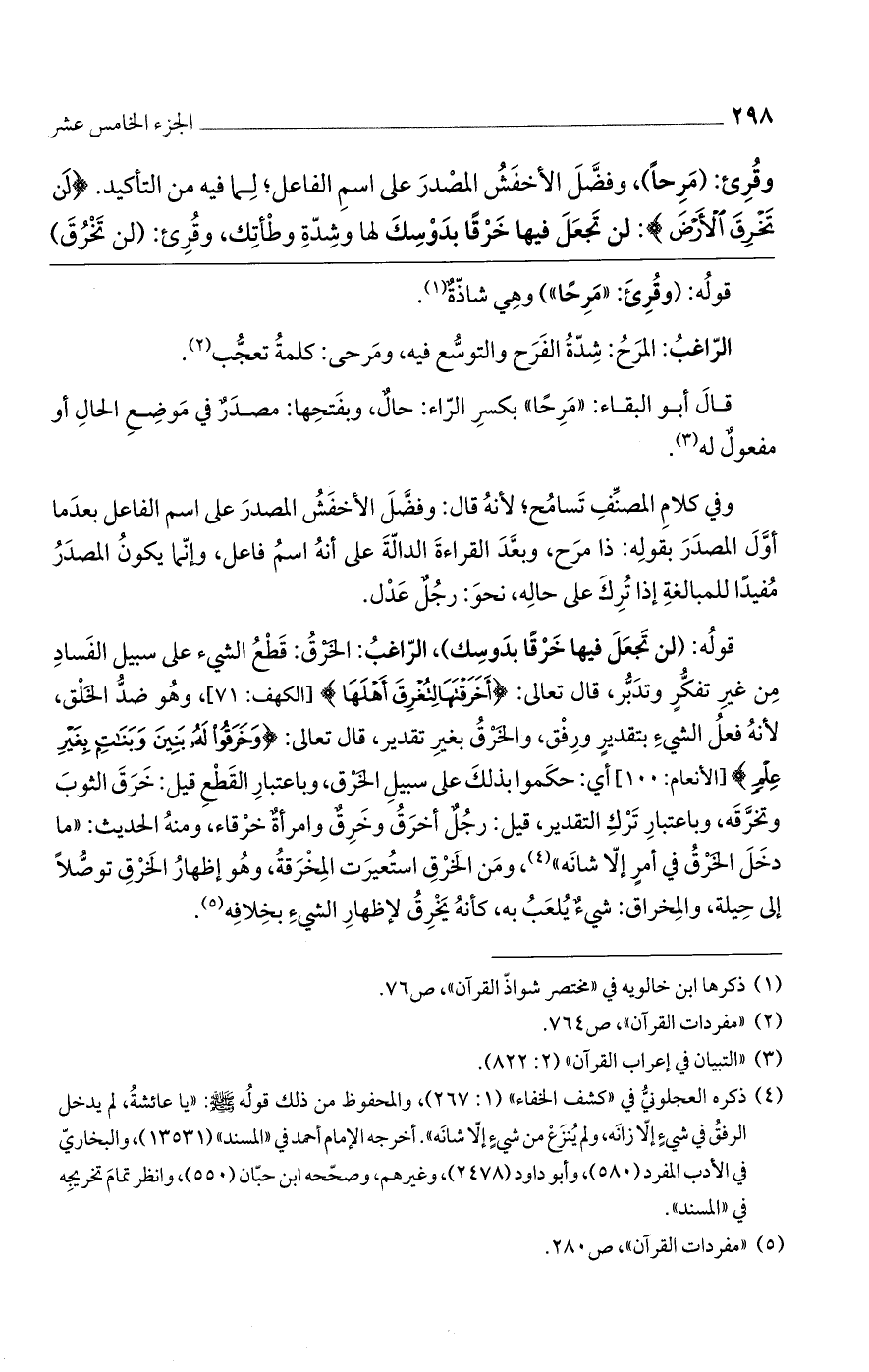 وقرئ (مَرَحًا) وفضل الأخفش المصدر على اسم الفاعل لما فيه من التأكيد (لَنْ تَخْرِقَ الْأَرْضَ): لن تجعل فيها خرقا بدوسك لها وشدّة وطأتك. وقرئ. (لن تخرق)،