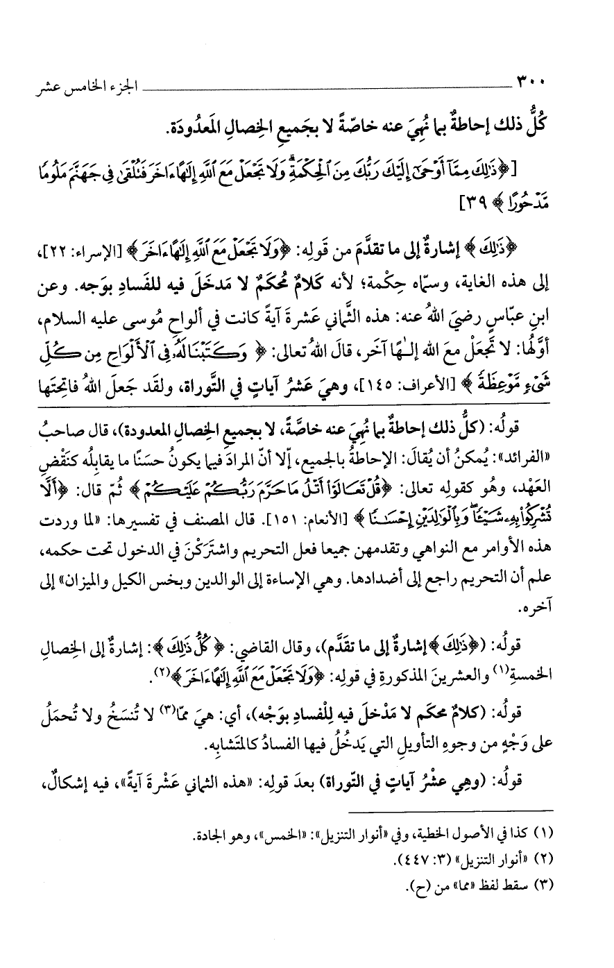 قوله: ((ذَلِكَ) إشارة إلى ما تقدم)، وقال القاضي: (كُلُّ ذَلِكَ): إشارة إلى الخصال الخمسة والعشرين المذكورة في قوله: (وَلا تَجْعَلْ مَعَ اللَّهِ إِلَهاً آخَرَ).