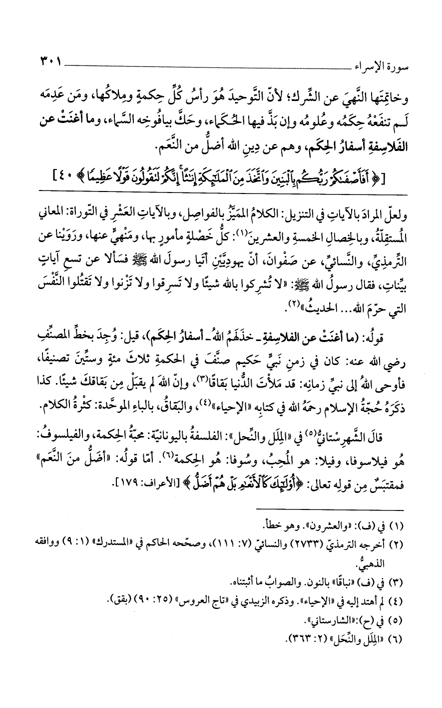قال الشهرستاني في "الملل والنحل": الفلسفة باليونانية: محبة الحكمة، والفيلسوف: هو فيلاسوفاً، وفيلا: هو المحب، وسُوفا: هو الحكمة، أما قوله: "أضل من النعم" فمقتبس من قوله تعالى: (أُوْلَئِكَ كَالأَنْعَامِ بَلْ هُمْ أَضَلُّ) [الأعراف: 179].
