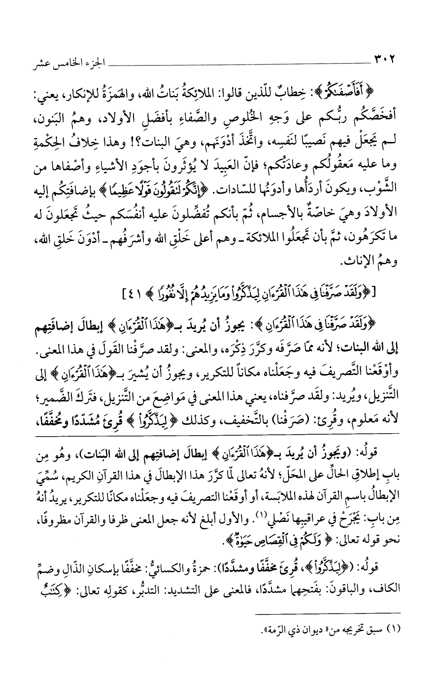 (وَلَقَدْ صَرَّفْنا فِي هذَا الْقُرْآنِ) يجوز أن يريد (هذَا الْقُرْآنِ) إبطال إضافتهم إلى الله البنات، لأنه مما صرفه وكرّر ذكره، والمعنى: ولقد صرفنا القول في هذا المعنى. أو أوقعنا التصريف فيه وجعلناه مكانا للتكرير. ويجوز أن يشير بهذا القرآن إلى التنزيل ويريد. ولقد صرفناه، يعنى هذا المعنى في مواضع من التنزيل، فترك الضمير لأنه معلوم. وقرئ: (صَرَّفْنا) بالتخفيف وكذلك (لِيَذَّكَّرُوا) قرئ مشدّدا ومخففًا،