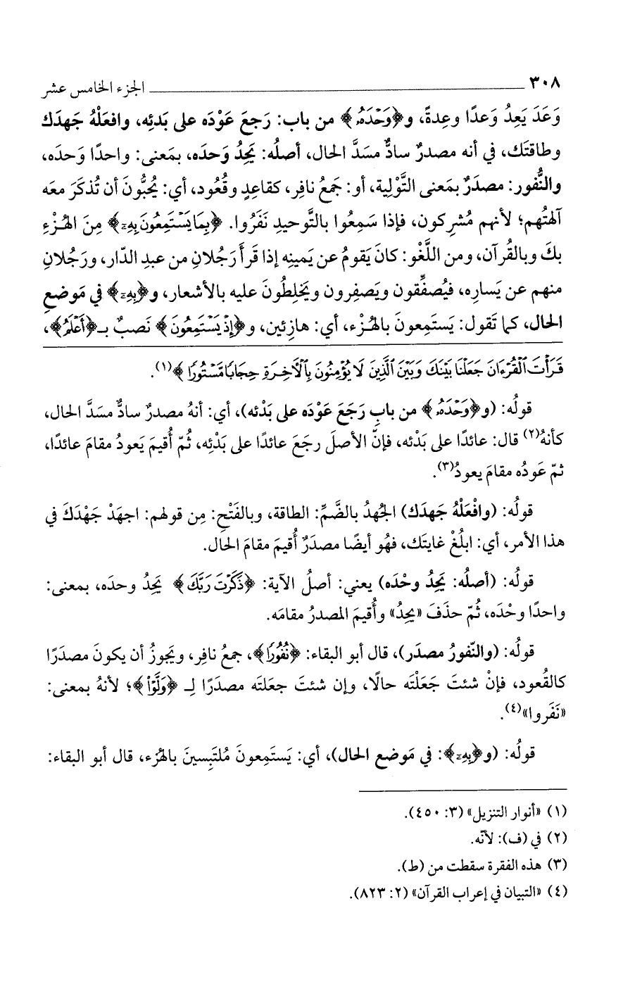 قوله: (و (وَحْدَهُ) من باب رجع عوده على بدئه)، أي: أنه مصدرٌ سادٌ مسد الحال، كأنه قال: عائداً على بدئه، فإن الأصل رجع عائداً على بدئه، ثم أقيم يعود مقام عائداً، ثم عوده مقام يعود.