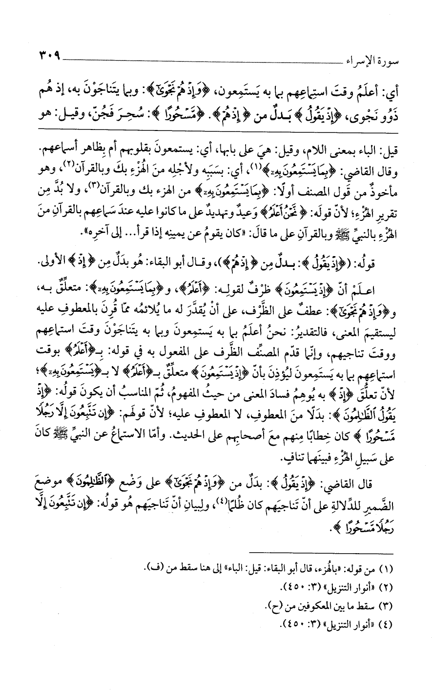 قوله: ((إِذْ يَقُولُ): بدلٌ من (إذ هُم))، وقال أبو البقاء: هو بدلٌ من (إذْ) الأولى. اعلم أن (إِذْ يَسْتَمِعُونَ) ظرفٌ لقوله: (أَعْلَمُ)، و (بِمَا يَسْتَمِعُونَ بِهِ): متعلق به، و (وَإِذْ هُمْ نَجْوَى): عطفٌ على الظرف، على أن يُقدر له ما يلائمه مما قُرن بالمعطوف عليه ليستقيم المعنى، فالتقدير: نحنُ أعلمُ بما به يستمعون وبما به يتناجون وقت استماعهم ووقت تناجيهم، وإنما قدم المصنف الظرف على المفعول به في قوله: بـ (أَعْلَمُ) بوقت استماعهم بما به يستمعون ليؤذن بأن (إِذْ يَسْتَمِعُونَ) متعلق بـ (أَعْلَمُ) لا بـ (يَسْتَمِعُونَ بِهِ)؛ لأن تعلق (إذ) به يوهم فساد المعنى من حيث المفهوم، ثم المناسب أن يكون قوله: (إِذْ يَقُولُ الظَّالِمُونَ): بدلاً من المعطوف، لا المعطوف عليه؛ لأن قولهم: (إِنْ تَتَّبِعُونَ إِلاَّ رَجُلاً مَسْحُوراً) كان خطاباً منهم مع أصحابهم على الحديث. وأما الاستماع عن النبي صلى الله عليه وسلم كان على سبيل الهزء فبينهما تنافٍ.