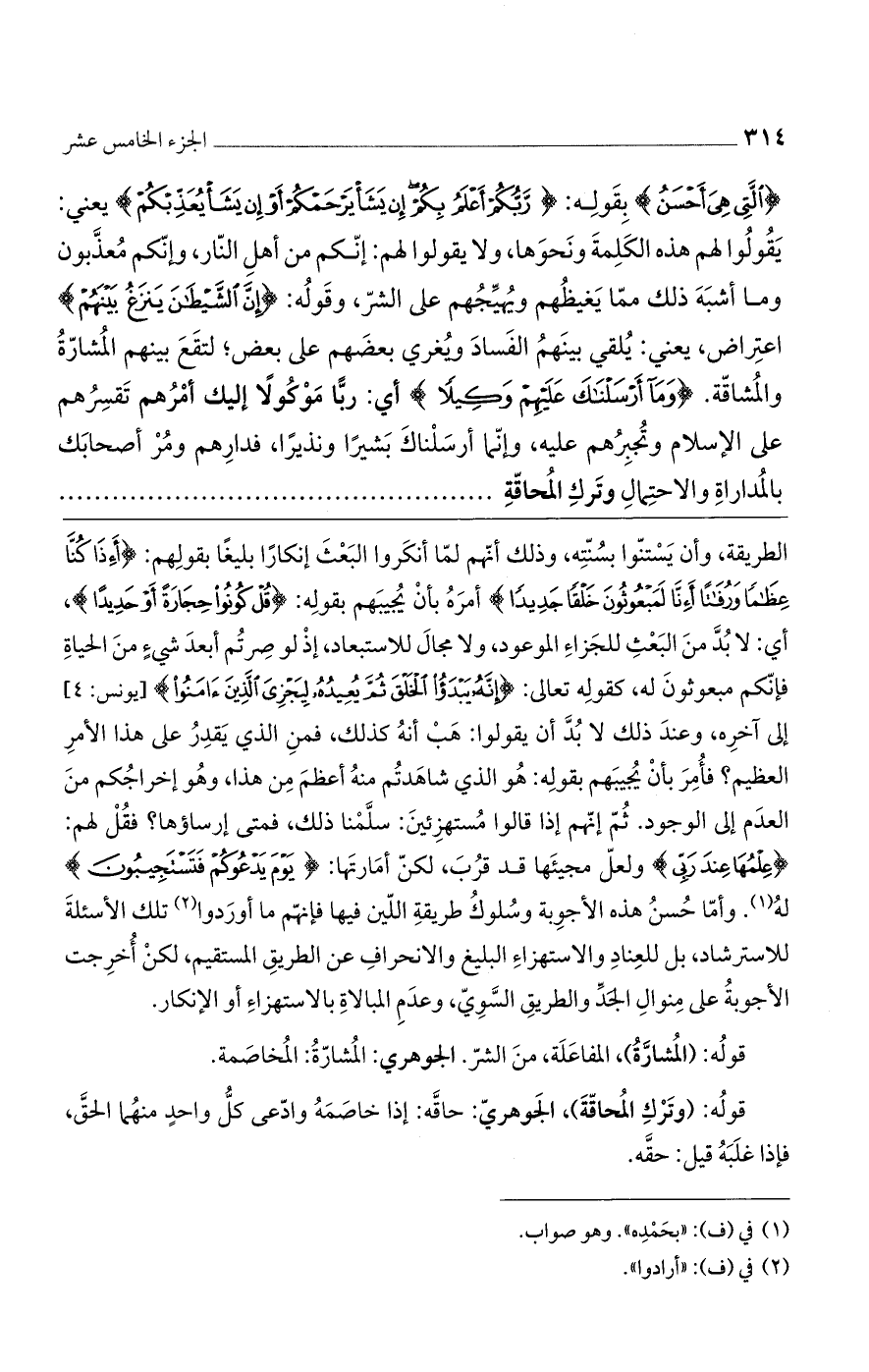 الطريقة، وأن يستنوا بسنته، وذلك أنهم لما أنكروا البعث إنكاراً بليغاً بقولهم: (أَئِذَا كُنَّا عِظَاماً وَرُفَاتاً أَئِنَّا لَمَبْعُوثُونَ خَلْقاً جَدِيداً) أمره بأن يجيبهم بقوله: (قُلْ كُونُوا حِجَارَةً أَوْ حَدِيداً)، أي: لابد من البعث للجزاء الموعود، ولا مجال للاستبعاد، إذ لو صرتم أبعد شيء من الحياة فإنكم مبعوثون له، كقوله تعالى: (إِنَّهُ يَبْدَأُ الْخَلْقَ ثُمَّ يُعِيدُهُ لِيَجْزِيَ الَّذِينَ آمَنُوا) [يونس: 4] إلى آخره، وعند ذلك لابد أن يقولوا: هب أنه كذلك، فمن الذي يقدر على هذا الأمر العظيم؟ فأُمر بأن يجيبهم بقوله: هو الذي شاهدتم منه أعظم من هذا، وهو إخراجكم من العدم إلى الوجود. ثم إنهم إذا قالوا مستهزئين: سلمنا ذلك، فمتى إرساؤها؟ فقل لهم: (عِلْمُهَا عِنْدَ رَبِّي) ولعل مجيئها قد قرُب، لكن أمارتها: (يَوْمَ يَدْعُوكُمْ فَتَسْتَجِيبُونَ) له. وأما حُسنُ هذه الأجوبة وسلوك طريقة اللين فيها فإنهم ما أوردوا تلك الأسئلة للاسترشاد، بل للعناد والاستهزاء البليغ والانحراف عن الطريق المستقيم، لكن أخرجت الأجوبة على منوال الجد والطريق السوي، وعدم المبالاة بالاستهزاء أو الإنكار.