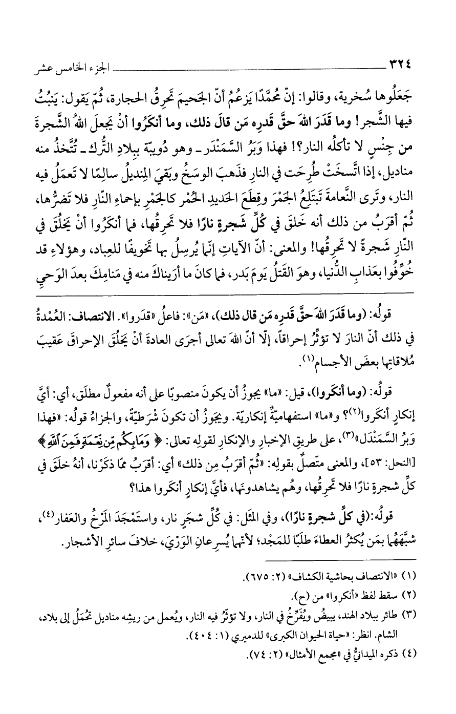 قوله: (وما أنكروا)، قيل: "ما" يجوز أن يكون منصوباً على أنه مفعولٌ مطلق، أي: أي إنكار أنكروا؟ و"ما" استفهامية إنكارية. ويجوز أن تكون شرطية، والجزاء قوله: "فهذا وبرُ السمندل"، على طريق الإخبار والإنكار لقوله تعالى: (وَمَا بِكُمْ مِنْ نِعْمَةٍ فَمِنْ اللَّهِ) [النحل: 53]، والمعنى متصلٌ بقوله: "ثم أقربُ من ذلك" أي: أقرب مما ذكرنا، أنه خلق في كل شجرة ناراً فلا تحرقها، وهم يشاهدونها، فأي إنكارٍ أنكروا هذا؟