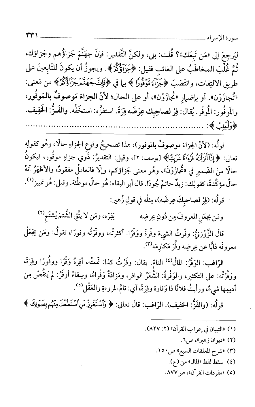 قال الزوزني: وفرتُ الشيء وفرة ووفراً: أكثرته، ووفرته وفوراً، تقول: ومن يجعل معروفه ذاباً عن عرضه وفر مكارمه.
