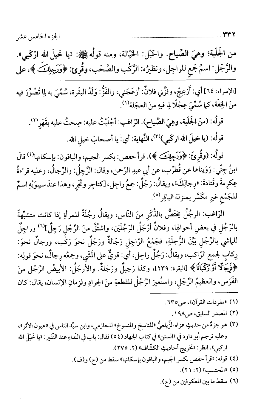 قوله: (وقرئ: (وَرَجِلِكَ)). قرأ حفص: بكسر الجيم، والباقون: بإسكانها قال ابن جني: رويناها عن قُطرُب، عن أبي عبد الرحمن، وقال: الرجِلُ: والرجال، وعليه قراءة عكرمة وقتادة: "رجالك"، ويقالُ: رجل: جمع راجل، [تاجر وتجرٍ، وهذا عند سيبويه اسم للجمع غير مكسر بمنزلة الباقر.