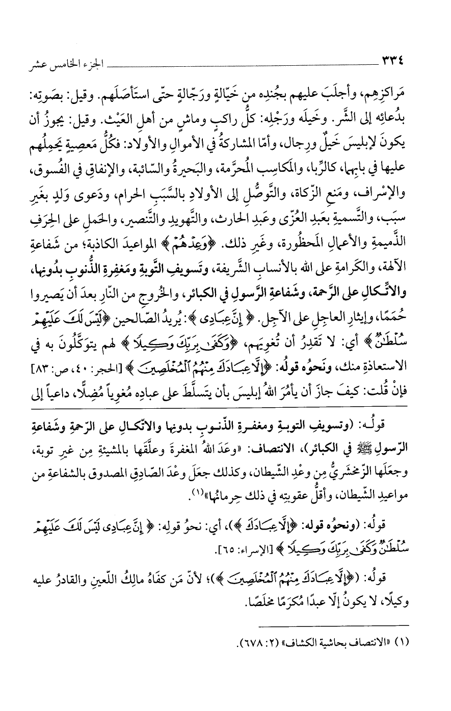 قوله: (ونحوه قوله: (إِلاَّ عِبَادَكَ))، أي: نحو قوله: (إِنَّ عِبَادِي لَيْسَ لَكَ عَلَيْهِمْ سُلْطَانٌ وَكَفَى بِرَبِّكَ وَكِيلاً) [الإسراء: 65].