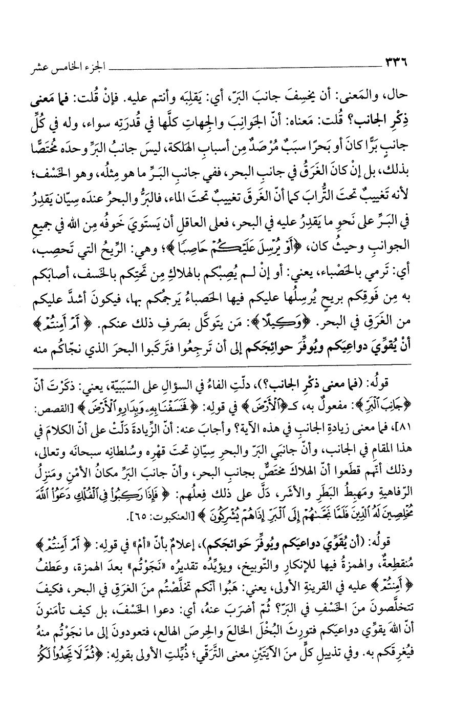 قوله: (فما معنى ذكر الجانب؟ ). دلت الفاء في السؤال على السببية، يعني: ذكرت أن (جَانِبَ الْبَرِّ): مفعولٌ به، كـ (الأَرْضِ) في قوله: (فَخَسَفْنَا بِهِ وَبِدَارِهِ الأَرْضَ) [القصص: 81]، فما معنى زيادة الجانب في هذه الآية؟ وأجاب عنه: أن الزيادة دلت على أن الكلام في هذا المقام في الجانب، وأن جانبي البر والبحر سيان تحت قهره وسلطانه سبحانه وتعالى، وذلك أنهم قطعوا أن الهلاك مختص بجانب البحر، وأن جانب البر مكان المن ومنزلُ الرفاهية ومهبط البطر والأشر، دل على ذلك فِعلُهم: (فَإِذَا رَكِبُوا فِي الْفُلْكِ دَعَوْا اللَّهَ مُخْلِصِينَ لَهُ الدِّينَ فَلَمَّا نَجَّاهُمْ إِلَى الْبَرِّ إِذَا هُمْ يُشْرِكُونَ) [العنكبوت: 65].
