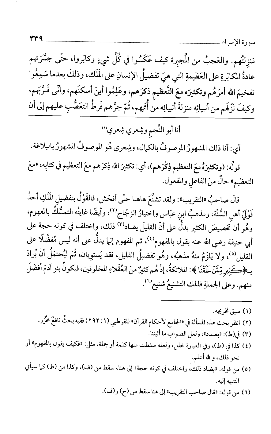 قال صاحب "التقريب": ولقد تشنع هاهنا حتى أفحش، فالقول بتفضيل الملك احد قولي أهل السنة، ومذهب ابن عباس واختيار الزجاج، وأيضاً غايته التمسك بالمفهوم، وهو أن تخصيص الكثير يدل على أن القليل يضاد ذلك، واختلف في كونه حجة على أبي حنيفة رضي الله عنه يقول بالمفهوم، ثم المفهوم إنما يدل على أنه ليس مفضلاً على القليل، ولا يلزم منه مذهبه، وهو تفضيل القليل، فقد يستويان، ثم ليحتمل أن يُراد بـ (كَثِيرٍ مِمَّنْ خَلَقْنَا): الملائكة، إذ هم كثيرٌ من العقلاء المخلوقين، فيكون بنو آدم أفضل منهم. وعلى الجملة فذلك التشنيع شنيع.
