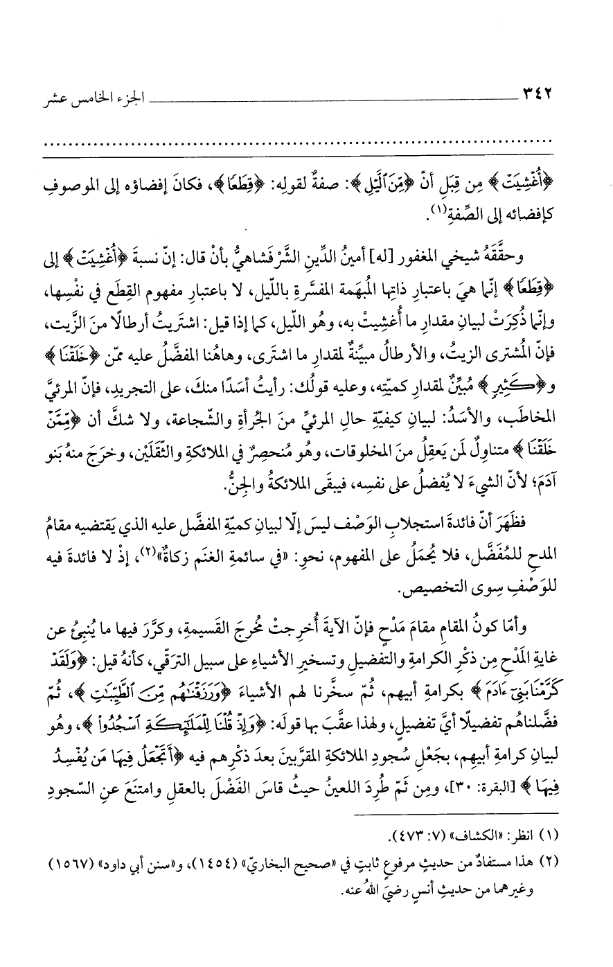 وحققه شيخي المغفور [له] أمين الدين الشرفشاهي بأن قال: إن نسبة (أُغْشِيَتْ) إلى (قِطَعاً) إنما هي باعتبار ذاتها المبهمة المفسرة بالليل، لا باعتبار مفهوم القطع في نفسها، وإنما ذُكرت لبيان مقدار ما أغشيت به، وهو الليل، كما إذا قيل: اشتريت أرطالاً من الزيت، فإن المشترى الزيت، والأرطال مبينة لمقدار ما اشترى، وهاهنا المفضل عليه ممن (خَلَقْنَا) و (كَثِيرٍ) مبينٌ لمقدار كميته، وعليه قولك: رأيت أسداً منك، على التجريد، فإن المرئي المخاطب، والأسد: لبيان كيفية حال المرئي من الجرأة والشجاعة، ولا شك أن (مِمَّنْ خَلَقْنَا) متناولٌ لمن يعقلُ من المخلوقات، وهو منحصر في الملائكة والثقلين، وخرج منه بنو آدم؛ لأن الشيء لا يُفضل على نفسه، فيبقى الملائكة والجن.