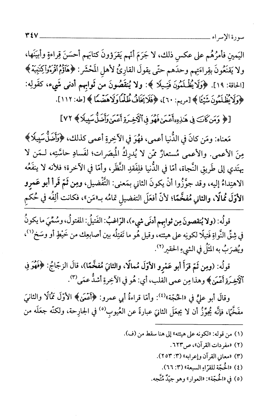 قوله: (ومن ثم قرأ أبو عمرو الأول ممالاً، والثاني مفخماً)، قال الزجاج: (فَهُوَ فِي الآخِرَةِ أَعْمَى) وهذا من عمى القلب، أي: هو في الآخرة أشد عمى.