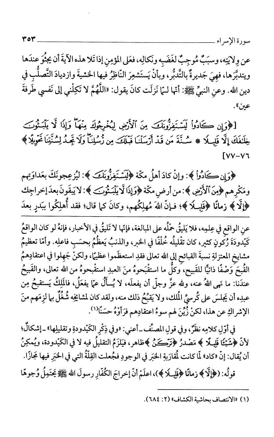 (وَإِنْ كادُوا) وإن كاد أهل مكة (لَيَسْتَفِزُّونَكَ) ليزعجونك بعداوتهم ومكرهم مِنَ الْأَرْضِ من أرض مكة وَإِذاً لا (يَلْبَثُونَ) لا يبقون بعد إخراجك (إِلَّا) زمانا (قَلِيلًا) فإن الله مهلكهم وكان كما قال، فقد أهلكوا ببدر بعد