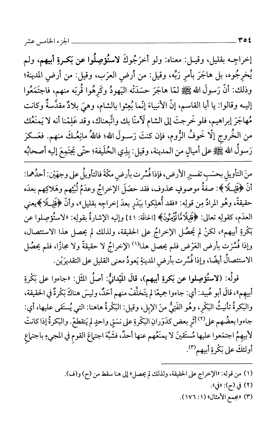 قوله: (لاستؤصلوا عن بكرة أبيهم)، قال الميداني: أصلُ المثل: "جاءوا على بكرة أبيهم"، قال أبو عبيد: أي: جاءوا جميعاً لم يتخلف منهم أحدٌ، وليس هناك بكرةٌ في الحقيقة، والبكرة تأنيث البكر، وهو الفتى من الإبل، وقيل: البكرة هاهنا: التي يُستقى عليها، أي: جاءوا بعضهم على أثر بعض كدوران البكرة على نسق واحد لم ينقطع. والبكرة إذا كانت لأبيهم اجتمعوا عليها مستقين لا يمنعهم عنها أحدٌ، فشبه اجتماع القوم في المجيء باجتماع أولئك على بكرة أبيهم.