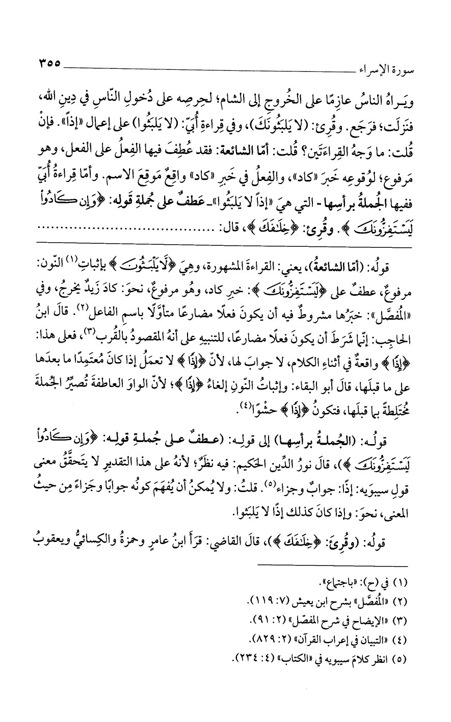 قوله: (الجملة برأسها) إلى قوله: (عطفٌ على جملة قوله: (وَإِنْ كَادُوا لَيَسْتَفِزُّونَكَ)، قال نور الدين الحكيم: فيه نظرٌ؛ لأنه على هذا التقدير لا يتحقق معنى قول سيبويه: إذاً: جوابٌوجزاء. قلت: ولا يمكنُ أن يُفهم كونه جواباً وجزاءً من حيث المعنى، نحو: وإذا كان كذلك إذاً لا يلبثوا.