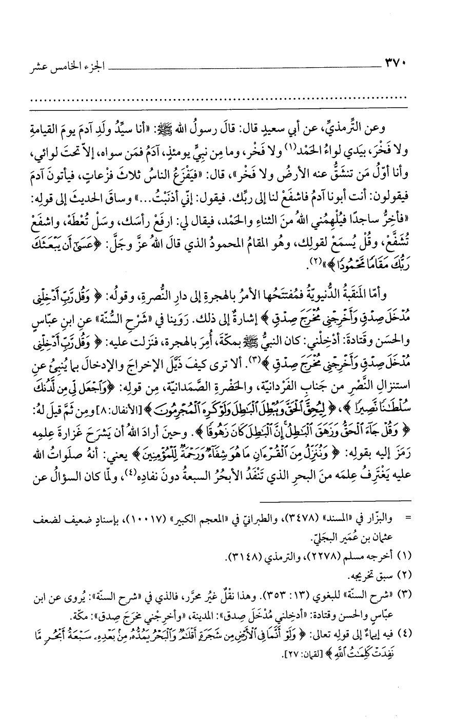 وعن الترمذي، عن أبي سعيد قال: قال رسول الله صلى الله عليه وسلم: "أنا سيدُ ولد آدم يوم القيامة ولا فخر، بيدي لواء الحمد ولا فخر، وما من نبي يومئذ، آدم فمن سواه، إلا تحت لوائي، وأنا أولُ من تنشق عنه الأرض ولا فخر"، قال: "فيفزع الناس ثلاث فزعات، فيأتون آدم فيقولون: أنت أبونا آدم فاشفع لنا إلى ربك. فيقول: إني أذنبتُ ... " وساق الحديث إلى قوله: "فأخر ساجداً فيلهمني الله من الثناء والحمد، فيقال لي: ارفع رأسك، وسل تُعطه، واشفع تُشفعن وقل يسمع لقولك، وهو المقام المحمود الذي قال الله عز وجل (عَسَى أَنْ يَبْعَثَكَ رَبُّكَ مَقَاماً مَحْمُوداً).