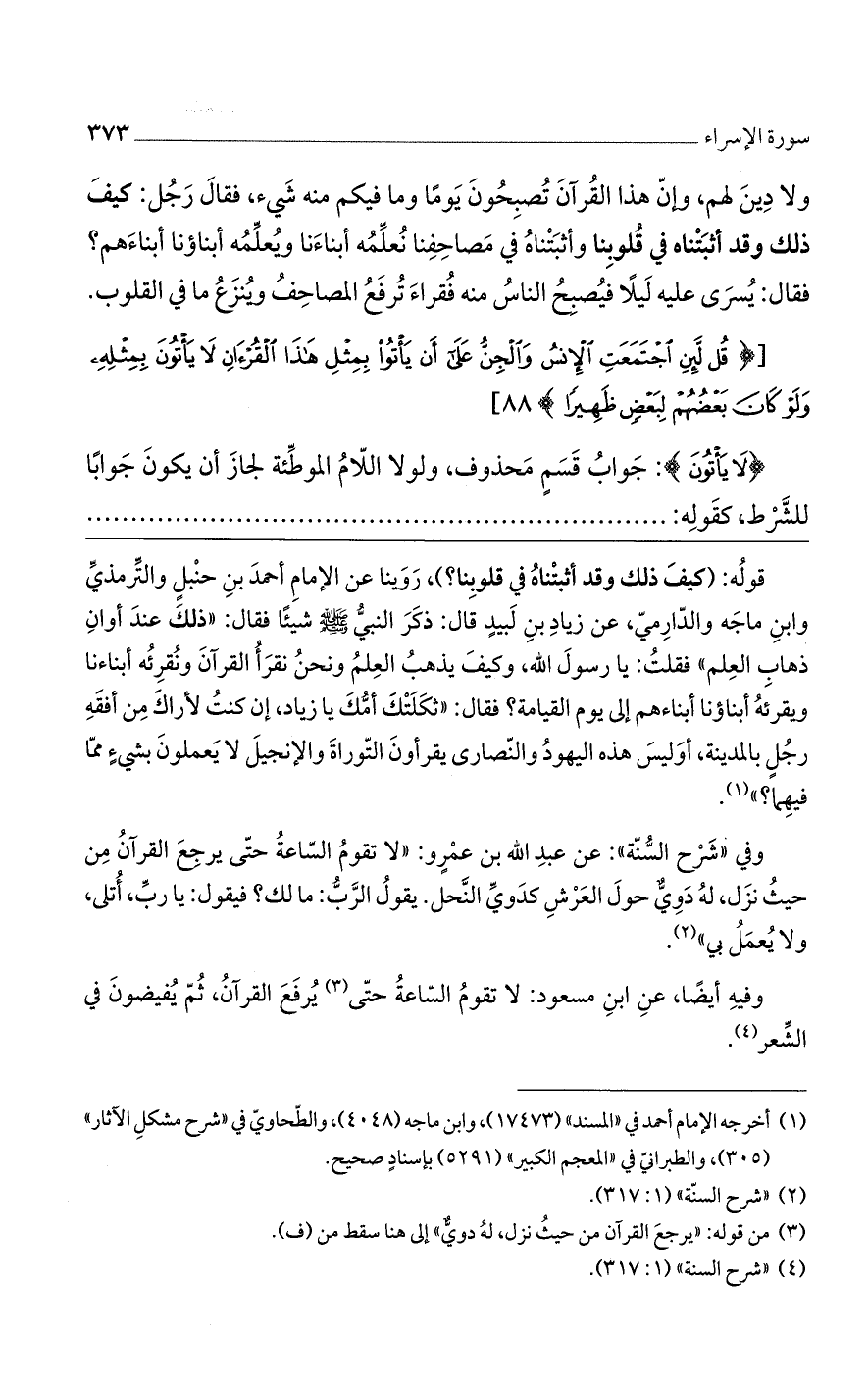 وفي "شرح السُّنة": عن عبد الله بن عمرو "لا تقوم الساعة حتى يرجع القرآن من حيثُ نزل، له دوي حول العرش كدوي النحل. يقول الرب: مالك؟ فيقول: يا رب، أُتلى، ولا يُعمل بي".