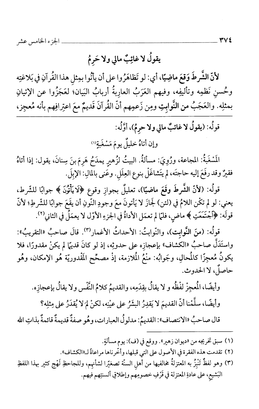 قوله: (من النوابت)، والنوابت: الأحداث الأغمار. قال صاحب "التقريب": واستدل صاحب "الكشاف" بإعجازه على حدوثه، إذ لو كان قديماً لم يكن مقدوراً، فلا يكون معجزاً كالمحال، وجوابه: منع الملازمة، إذ مصحح المقدورية هو الإمكان، وهو حاصل، لا الحدوث.