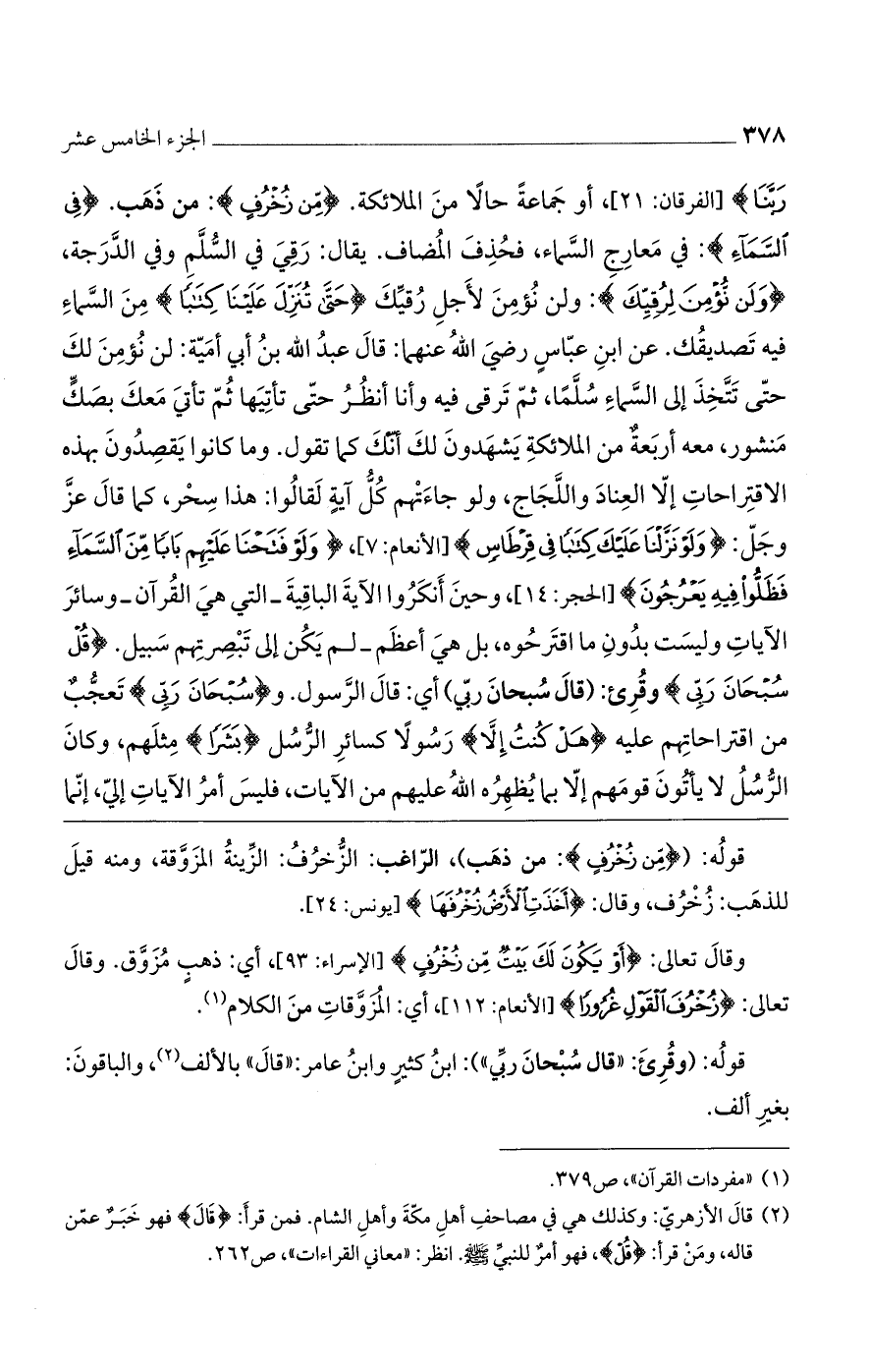 رَبَّنا) [الفرقان: 21] أو جماعة حالا من الملائكة. (مِنْ زُخْرُفٍ) من ذهب (فِي السَّماءِ): في معارج السماء، فحذف المضاف. يقال: رقى في السلم وفي الدرجة وَلَنْ نُؤْمِنَ لِرُقِيِّكَ ولن نؤمن لأجل رقيك (حَتَّى تُنَزِّلَ عَلَيْنا كِتاباً) من السماء فيه تصديقك. عن ابن عباس رضي الله عنهما: قال عبد الله بن أبي أمية: لن نؤمن لك حتى تتخذ إلى السماء سلما. ثم ترقى فيه وأنا أنظر حتى تأتيها ثم تأتى معك بصك منشور، معه أربعة من الملائكة يشهدون لك أنك كما تقول. وما كانوا يقصدون بهذه الاقتراحات إلا العناد واللجاج، ولو جاءتهم كل آية لقالوا: هذا سحر، كما قال عز وجل: (وَلَوْ نَزَّلْنا عَلَيْكَ كِتاباً فِي قِرْطاسٍ)] الأنعام: 7 [، (وَلَوْ فَتَحْنا عَلَيْهِمْ باباً مِنَ السَّماءِ فَظَلُّوا فِيهِ يَعْرُجُونَ)] الحجر: 14 [وحين أنكروا الآية الباقية التي هي القرآن وسائر الآيات وليست بدون ما اقترحوه - بل هي أعظم- لم يكن إلى تبصرتهم سبيل (قُلْ سُبْحانَ رَبِّي) وقرئ: قال سبحان ربي، أي قال الرسول. وسُبْحانَ رَبِّي تعجب من اقتراحاتهم عليه (هَلْ كُنْتُ) إِلَّا رسولا كسائر الرسل (بَشَراً) مثلهم، وكان الرسل لا يأتون قومهم إلا بما يظهره الله عليهم من الآيات، فليس أمر الآيات إليّ، إنما