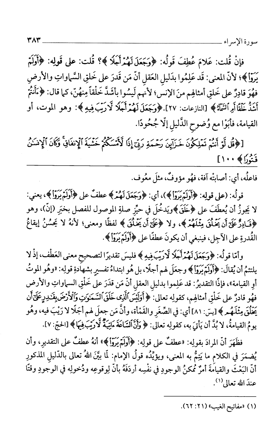 فظهر أن المراد بقوله: "عطفٌ على قوله: (أَوَلَمْ يَرَوْا) " أنه عطفٌ على التقدير، وأن يُضمر في الكلام ما يتم به المعنى، ويؤيده قول الإمام: لما بين الله تعالى بالدليل المذكور أن البعث والقيامة أمرٌ ممكنُ الوجود في نفسه أردفه بأن لوقوعه ودخوله في الوجود وقتاً عند الله تعالى.