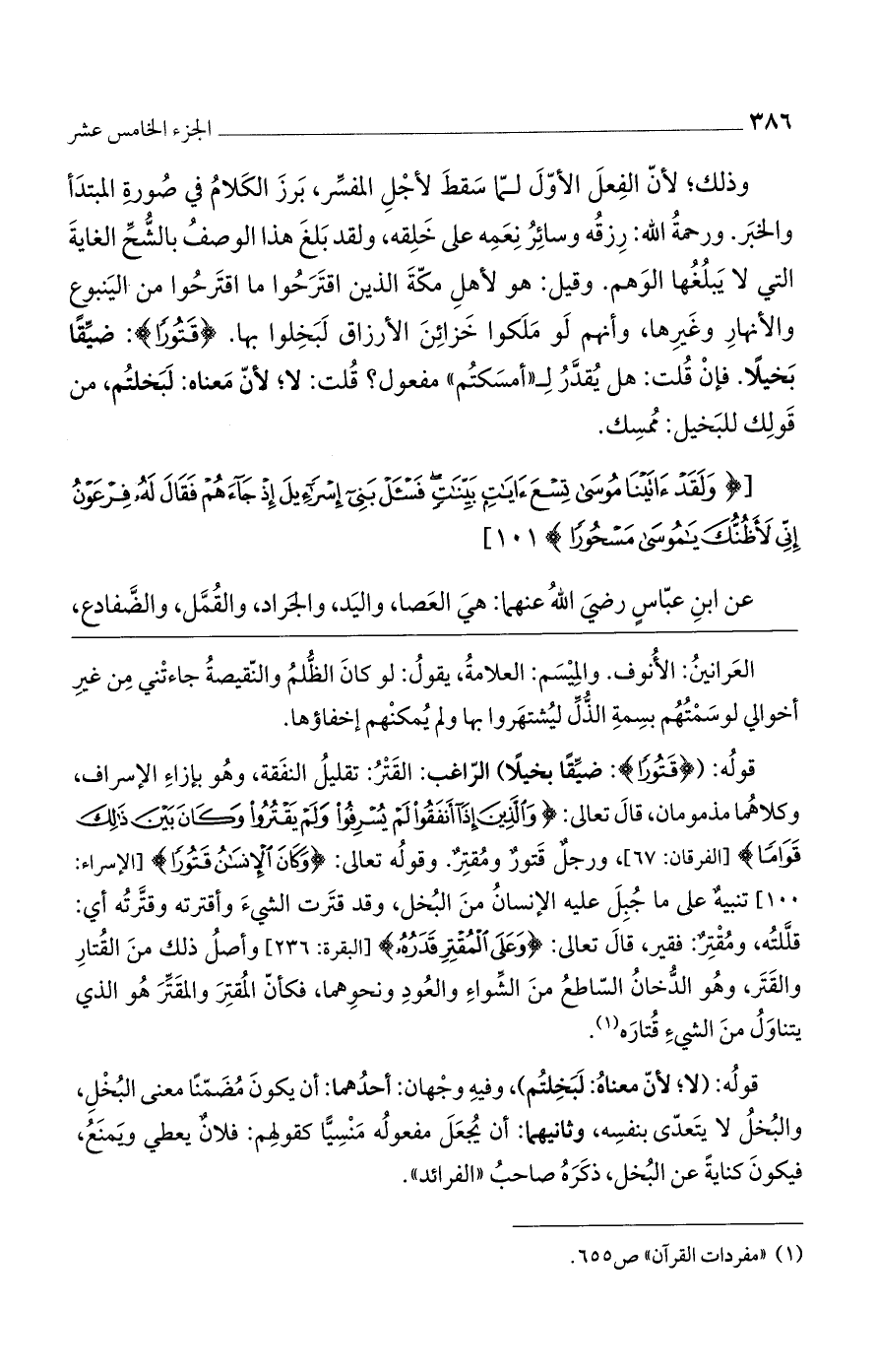 قوله: ((قَتُوراً): ضيقاً بخيلا) الراغب: القترُ: تقليل النفقة، وهو بإزاء الإسراف، وكلاهما مذمومان، قال تعالى: (وَالَّذِينَ إِذَا أَنفَقُوا لَمْ يُسْرِفُوا وَلَمْ يَقْتُرُوا وَكَانَ بَيْنَ ذَلِكَ قَوَاماً) [الفرقان: 67]، ورجلٌ قتورٌ ومقترٌ. وقوله تعالى: (وَكَانَ الإِنْسَانُ قَتُوراً) [الإسراء: 100] تنبيه على ما جُبل عليه الإنسان من البخل، وقد قترت الشيء وأقترته وقترته أي: قللته، ومُقترٌ: فقير، قال تعالى: (وَعَلَى الْمُقْتِرِ قَدَرُهُ) [البقرة: 236] وأصلُ ذلك من القُتار والقتر، وهو الدخان الساطع من الشواء والعود ونحوهما، فكأن المُقتر والمقترَ هو الذي يتناول من الشيء قتاره.
