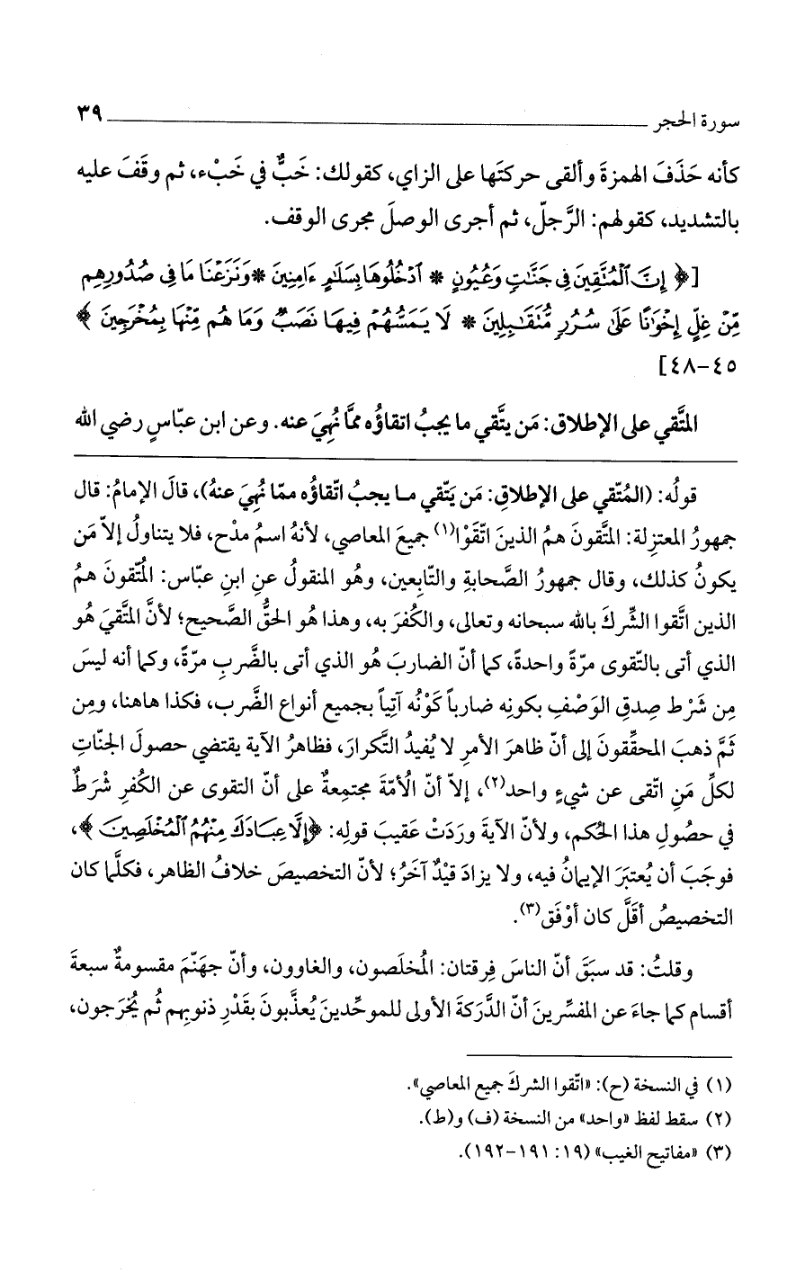 قوله: (المتقي على الإطلاق: من يتقي ما يجب اتقاؤه مما نُهي عنه)، قال الإمام: قال جمهور المعتزلة: المتقون هم الذين اتقوا جميع المعاصي، لأنه اسم مدح، فلا يتناول إلا من يكون كذلك، وقال جمهور الصحابة والتابعين، وهو المنقول عن ابن عباس: المتقون هم الذين اتقوا الشرك بالله سبحانه وتعالى، والكفر به، وهذا هو الحق الصحيح؛ لأن المتقي هو الذي أتى بالتقوى مرة واحدة، كما أن الضارب هو الذي أتى بالضرب مرة، وكما أنه ليس من شرط صدق الوصف بكونه ضارباً كونه آتيا بجميع أنواع الضرب، فكذا هاهنا، ومن ثم ذهب المحققون إلى أن ظاهر الأمر لا يفيد التكرار، فظاهر الآية يقتضي حصول الجنات لكل من اتقى عن شيء واحد، إلا أن الأمة مجتمعة على أن التقوى عن الكفر شرط في حصول هذا الحكم، ولأن الآية وردت عقيب قوله: (إِلاَّ عِبَادَكَ مِنْهُمْ الْمُخْلَصِينَ)، فوجب أن يعتبر الإيمان فيه، لا يزاد قيد آخر؛ لأن التخصيص خلاف الظاهر، فكلما كان التخصيص أقل كان أوفق.