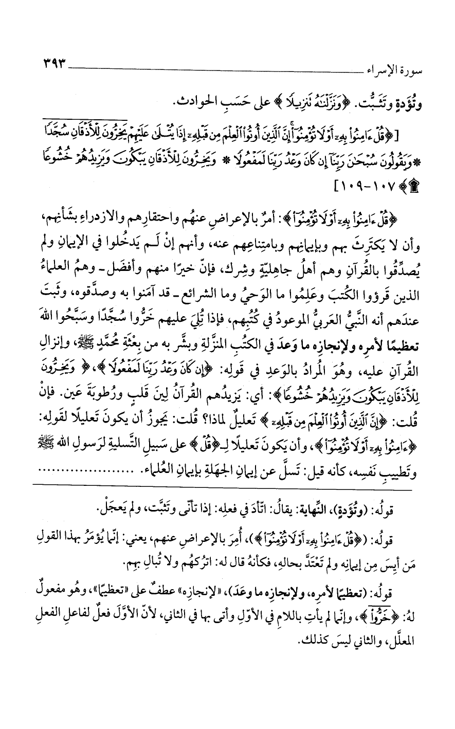 [(قُلْ آمِنُوا بِهِ أَوْ لا تُؤْمِنُوا إِنَّ الَّذِينَ أُوتُوا الْعِلْمَ مِنْ قَبْلِهِ إِذا يُتْلى عَلَيْهِمْ يَخِرُّونَ لِلْأَذْقانِ سُجَّداً * وَيَقُولُونَ سُبْحانَ رَبِّنا إِنْ كانَ وَعْدُ رَبِّنا لَمَفْعُولاً* وَيَخِرُّونَ لِلْأَذْقانِ يَبْكُونَ وَيَزِيدُهُمْ خُشُوعاً)].