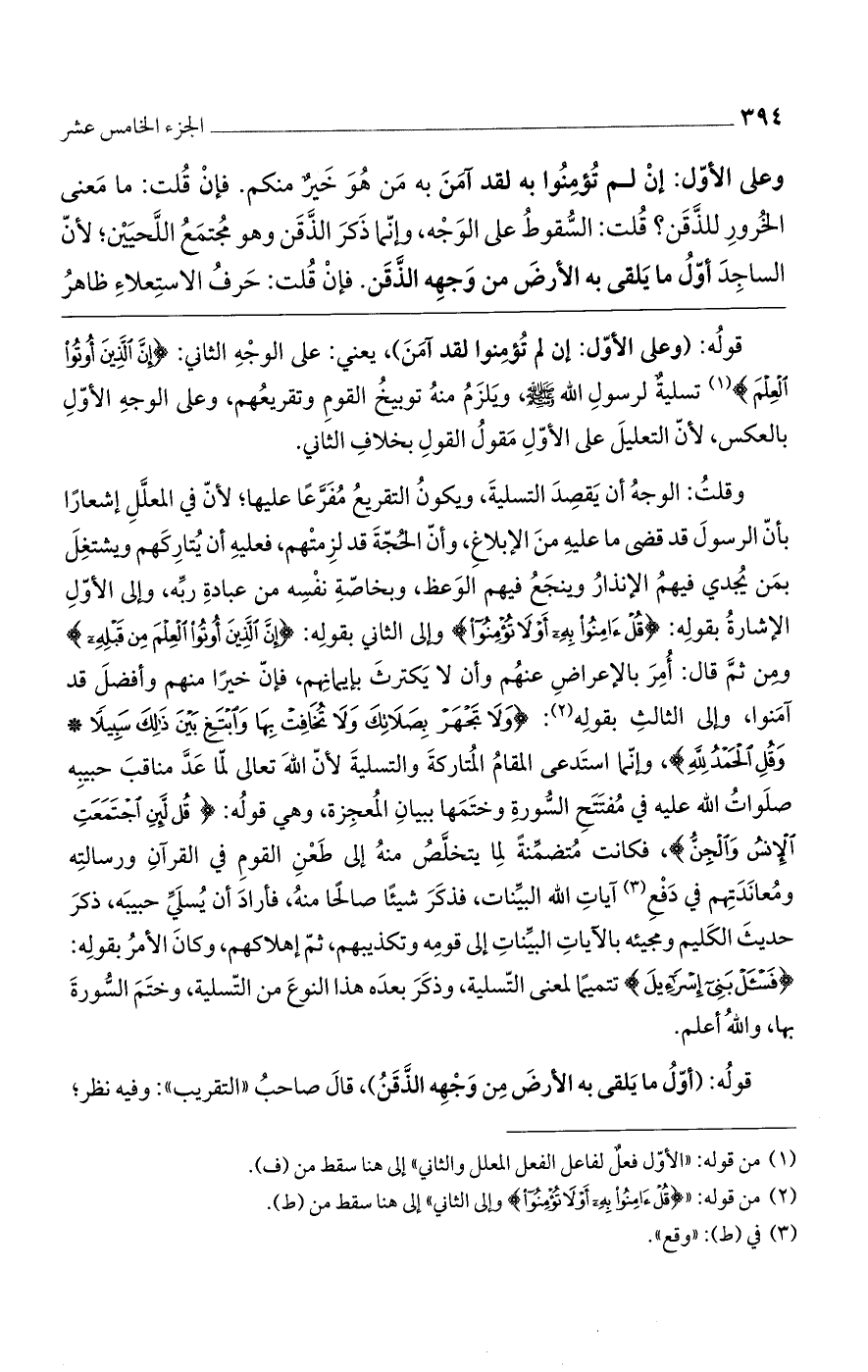 قوله: (وعلى الأول: إن لم تؤمنوا لقد آمن)، يعني: على الوجه الثاني: (إِنَّ الَّذِينَ أُوتُوا الْعِلْمَ) تسلية لرسول الله صلى الله عليه وسلم، ويلزم منه توبيخ القوم وتقريعهم، وعلى الوجه الأول بالعكس، لأن التعليل على الأول مقول القول بخلاف الثاني.