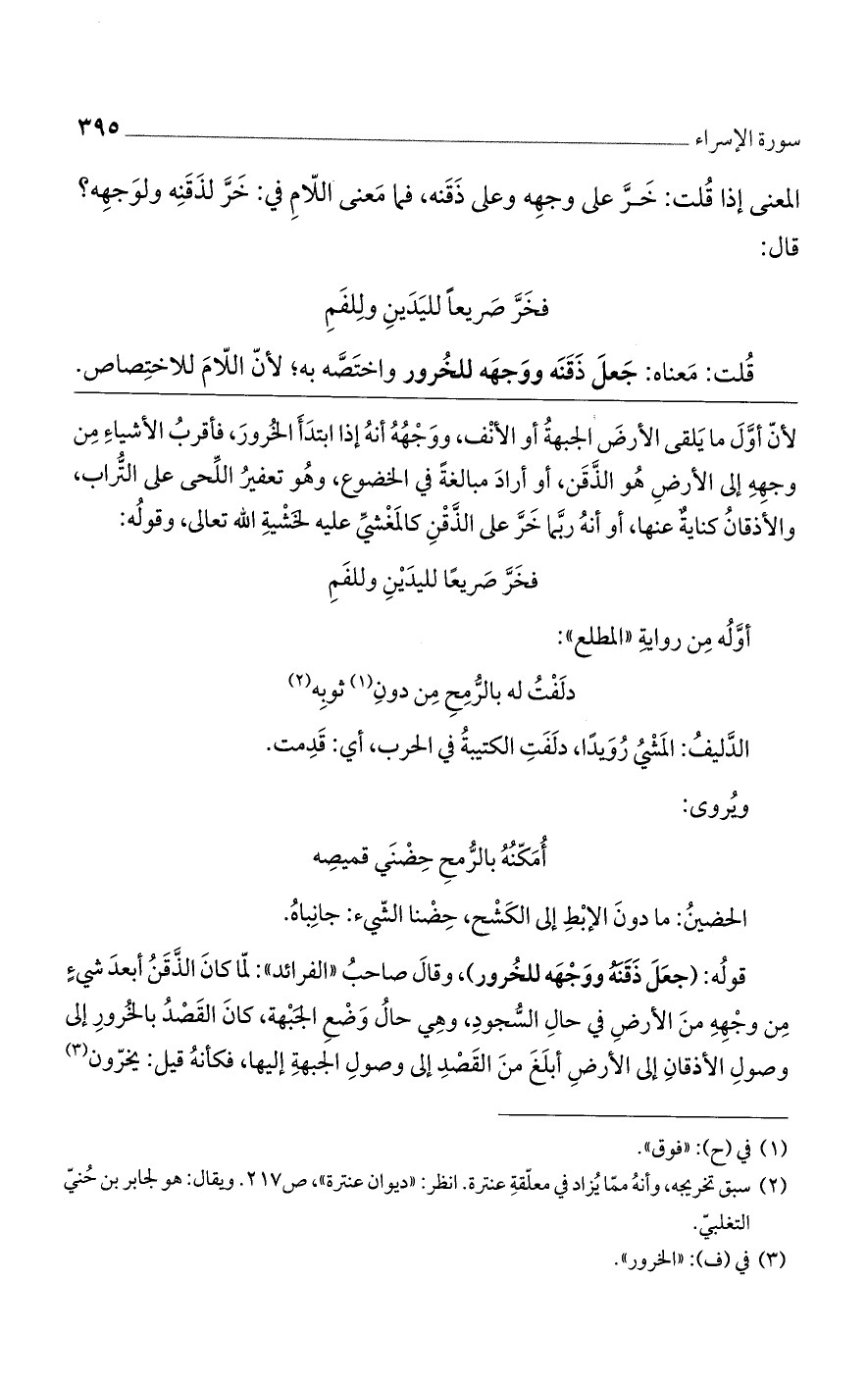 قوله: (جعل ذقنه ووجهه للخرور)، وقال صاحب "الفرائد": لما كان الذقن أبعد شيء من وجهه من الأرض في حال السجود، وهي حالُ وضع الجبهة، كان القصد بالخرور إلى وصول الأذقان إلى الأرض أبلغ من القصد إلى وصول الجبهة إليها، فكأنه قيل: يخرون