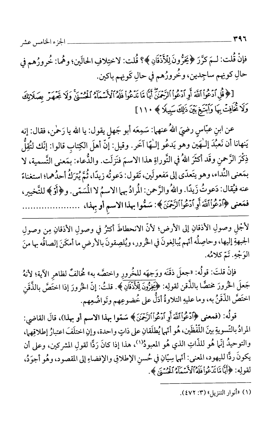 [(قُلِ ادْعُوا اللَّهَ أَوِ ادْعُوا الرَّحْمنَ أَيًّا ما تَدْعُوا فَلَهُ الْأَسْماءُ الْحُسْنى وَلا تَجْهَرْ بِصَلاتِكَ وَلا تُخافِتْ بِها وَابْتَغِ بَيْنَ ذلِكَ سَبِيلاً)].