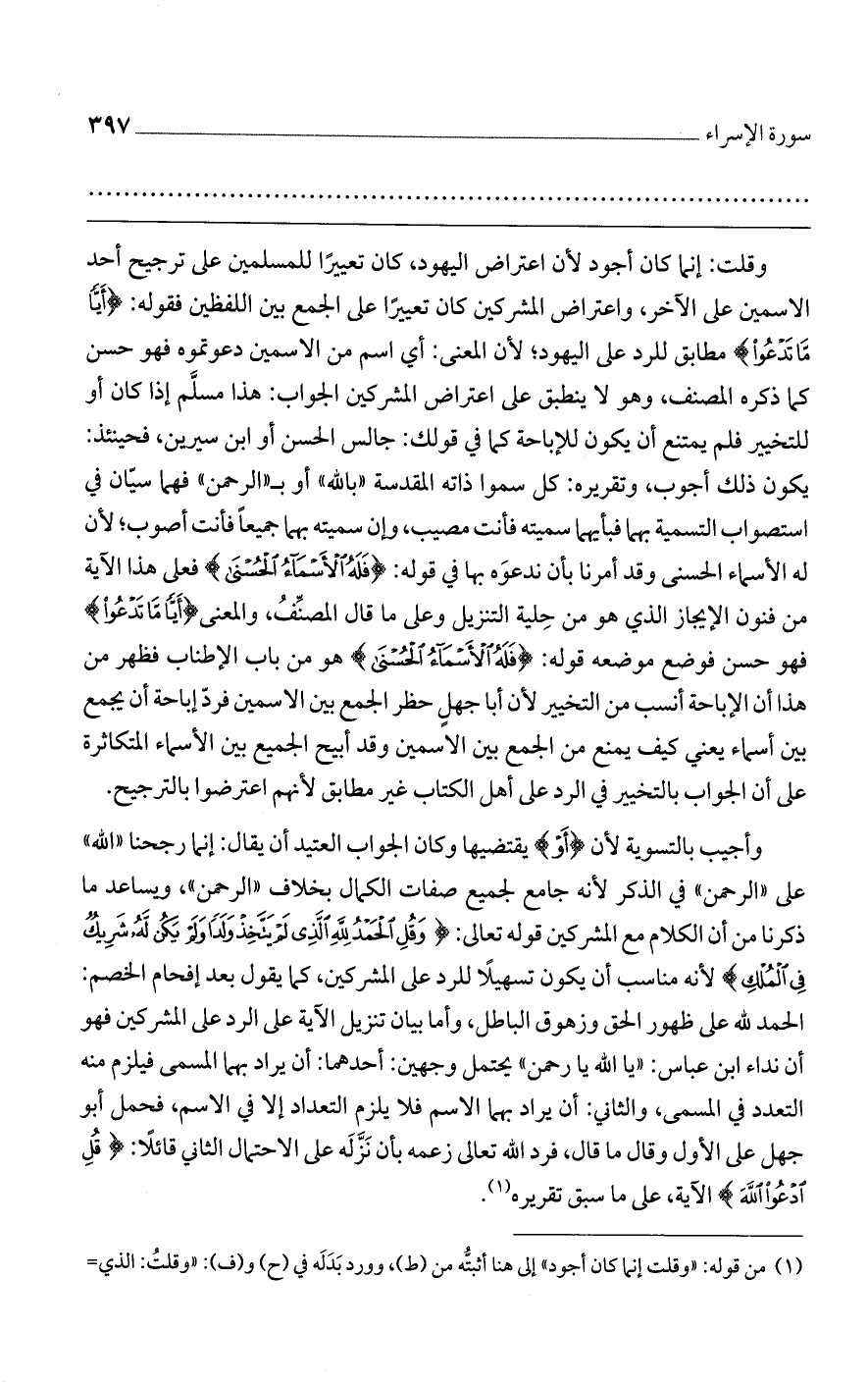 وقلت: إنما كان أجود لأن اعتراض اليهود، كان تعييراً للمسلمين على ترجيح أحد الاسمين على الآخر، واعتراض المشركين كان تعييراً على الجمع بين اللفظين فقوله: (أَيّاً مَا تَدْعُوا) مطابق للرد على اليهود؛ لأن المعنى: أي اسم من الاسمين دعوتموه فهو حسن كما ذكره المصنف، وهو لا ينطبق على اعتراض المشركين الجواب: هذا مسلم إذا كان أو للتخيير فلم يمتنع أن يكون للإباحة كما في قولك: جالس الحسن أو ابن سيرين، فحينئذ: يكون ذلك أجوب، وتقريره: كل سموا ذاته المقدسة "بالله" أو بـ"الرحمن" فهما سيان في استصواب التسمية بهما فبأيهما سميته فأنت مصيب، وإن سميته بهما جميعاً فأنت أصوب؛ لأن له الأسماء الحسنى وقد أمرنا بأن ندعوه بها في قوله: (فَلَهُ الأَسْمَاءُ الْحُسْنَى) فعلى هذا الآية من فنون الإيجاز الذي هو من حلة التنزيل وعلى ما قال المصنف، والمعنى (أَيّاً مَا تَدْعُوا) فهو حسن فوضع موضعه قوله: (فَلَهُ الأَسْمَاءُ الْحُسْنَى) هو من باب الإطناب فظهر من هذا أن الإباحة أنسب من التخيير لأن أبا جهل حر الجمع بين الاسمين فرد إباحة أن يجمع بين أسماء يعني كيف يمنع من الجمع بين الاسمين وقد أبيح الجميع بين الأسماء المتكاثرة على أن الجواب بالتخيير في الرد على أهل الكتاب غير مطابق لأنهم اعترضوا بالترجيح.